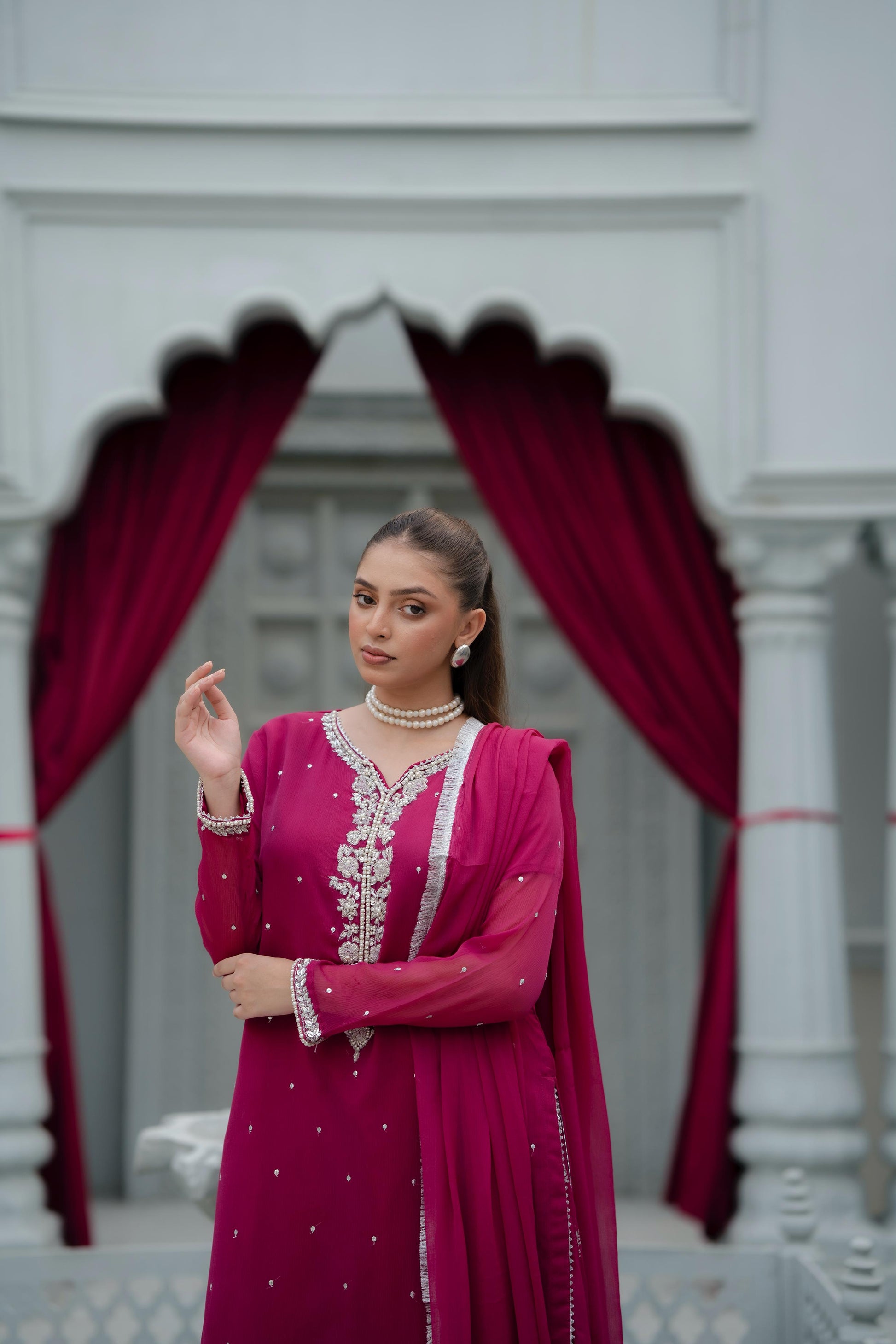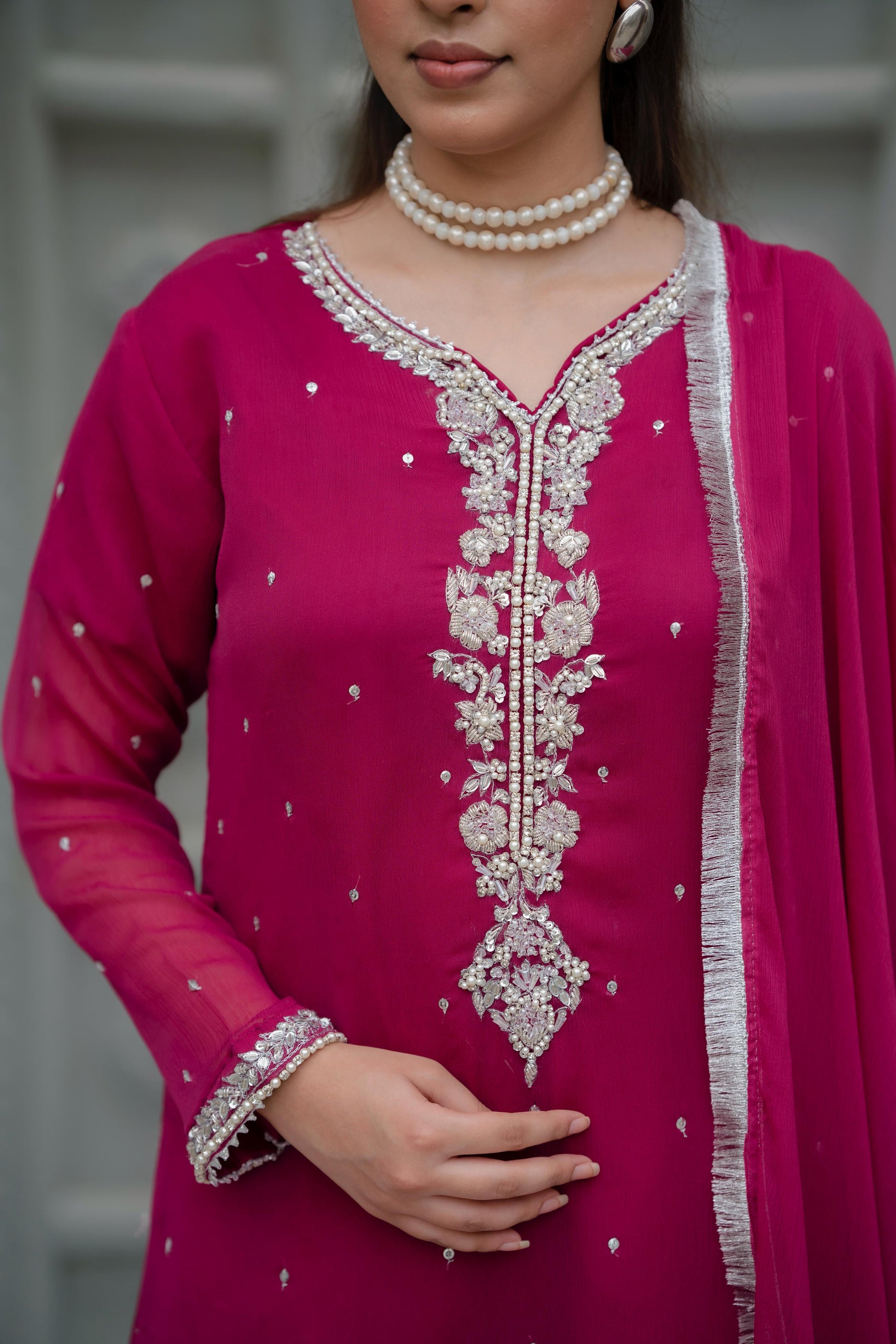 Fuchsia Pink Crinkle Chiffon With Printed Trouser & Handmade Embroidery