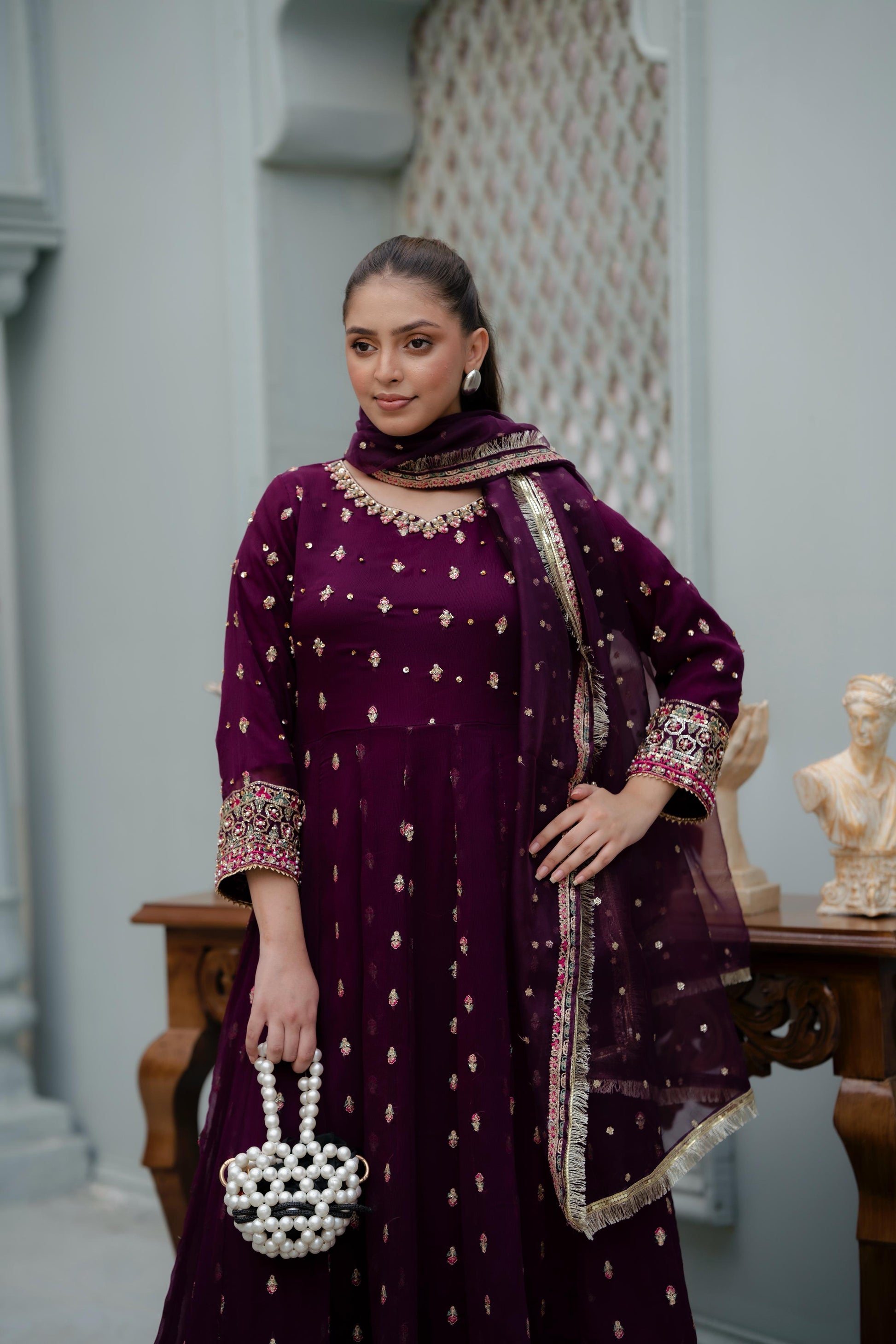 Turn heads with Gulnaz, an enchanting 3-piece suit in a regal purple tone. The crinkle chiffon shirt is beautifully adorned with golden embroidery and lace details, paired with raw silk trousers for a graceful silhouette. A matching purple organza dupatta with golden accents completes the outfit, adding charm and sophistication. Perfect for weddings, festive gatherings, and formal evenings.