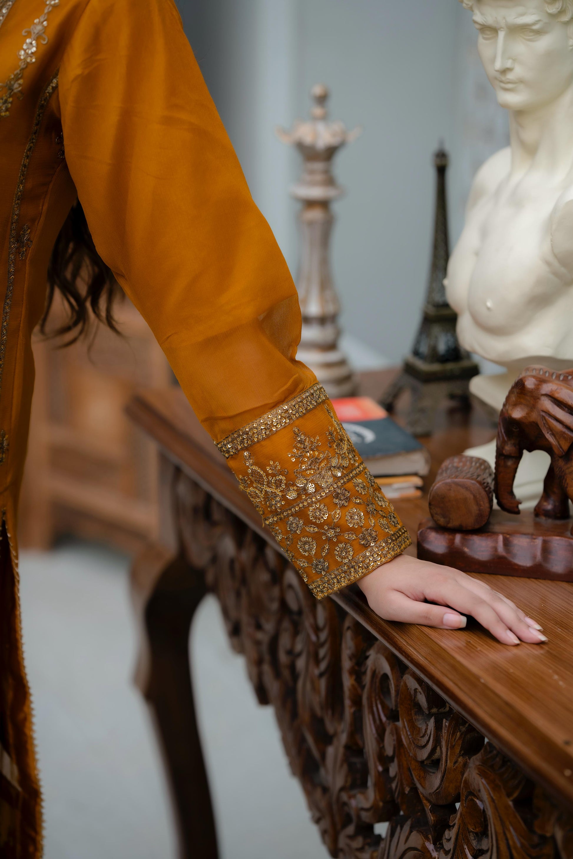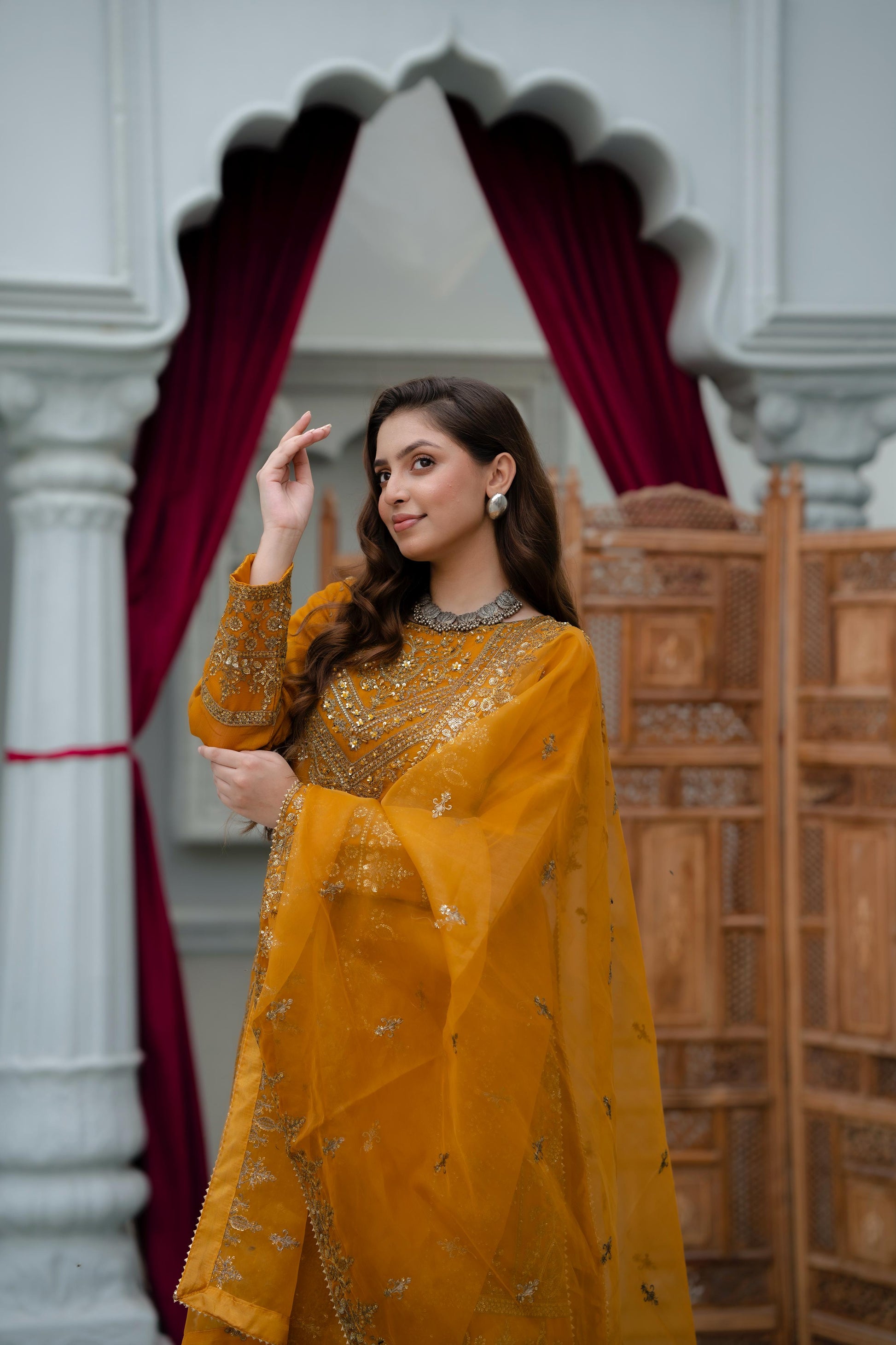 A masterpiece of timeless grace, Zeenat-e-Amber comes in a radiant mustard-gold hue that exudes festive warmth. The crinkle chiffon shirt and trousers are intricately adorned with delicate gold embroidery and embellishments, adding a touch of regality. Paired with a sheer organza dupatta, embellished with finely detailed motifs and borders, this ensemble strikes the perfect balance between tradition and modern sophistication.