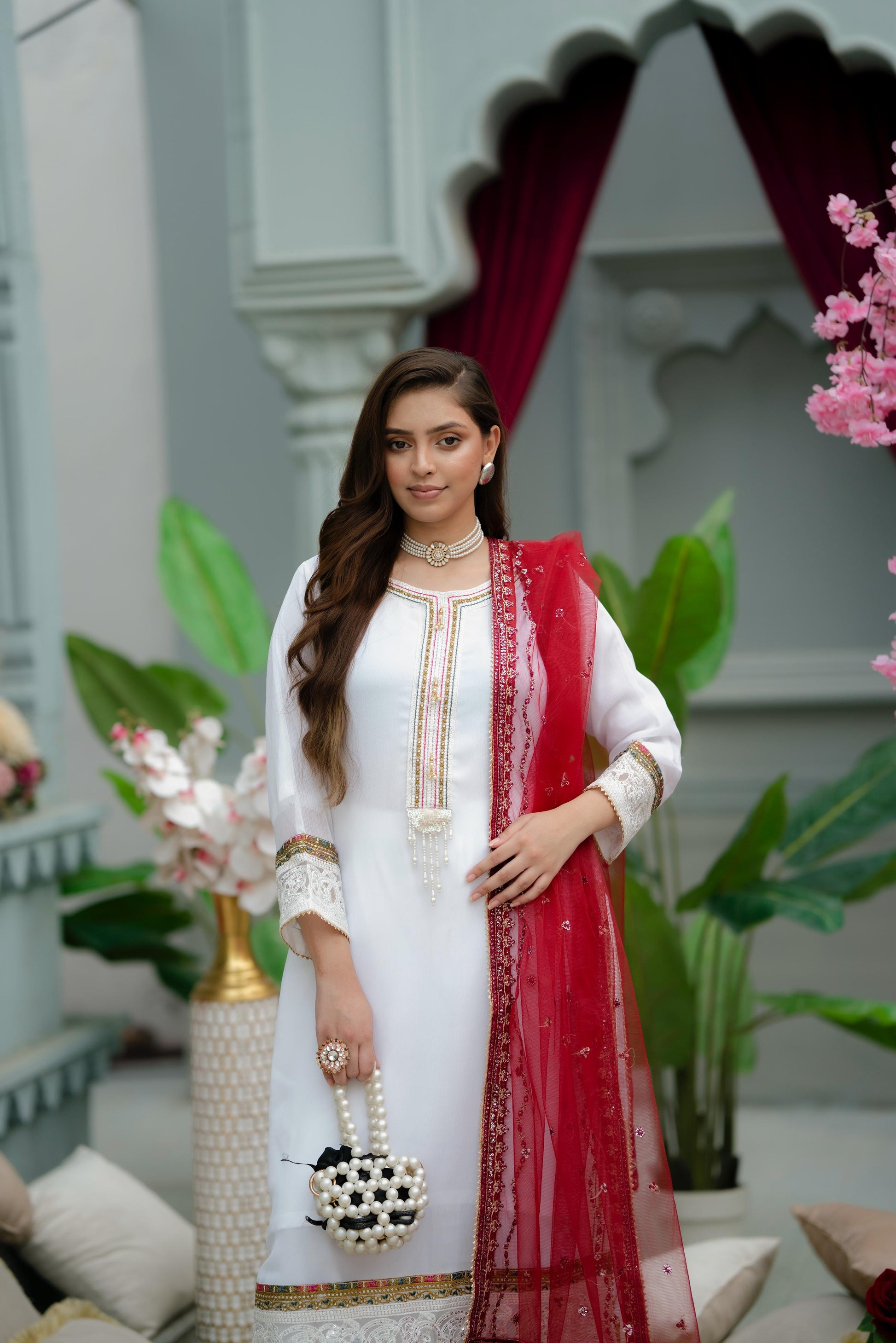 A timeless white and red ensemble designed with elegance in every detail. The crinkle chiffon shirt is delicately styled with fine embroidery and lace finishing, paired with raw silk trousers for a rich, graceful look. Completing the outfit is a red net dupatta, lightly adorned for the perfect festive touch. Ideal for weddings, formal gatherings, and special celebrations.